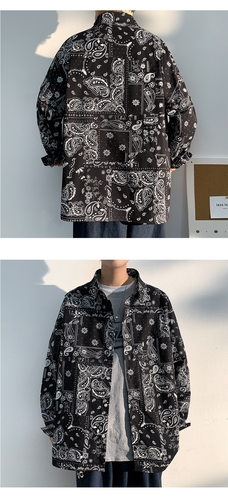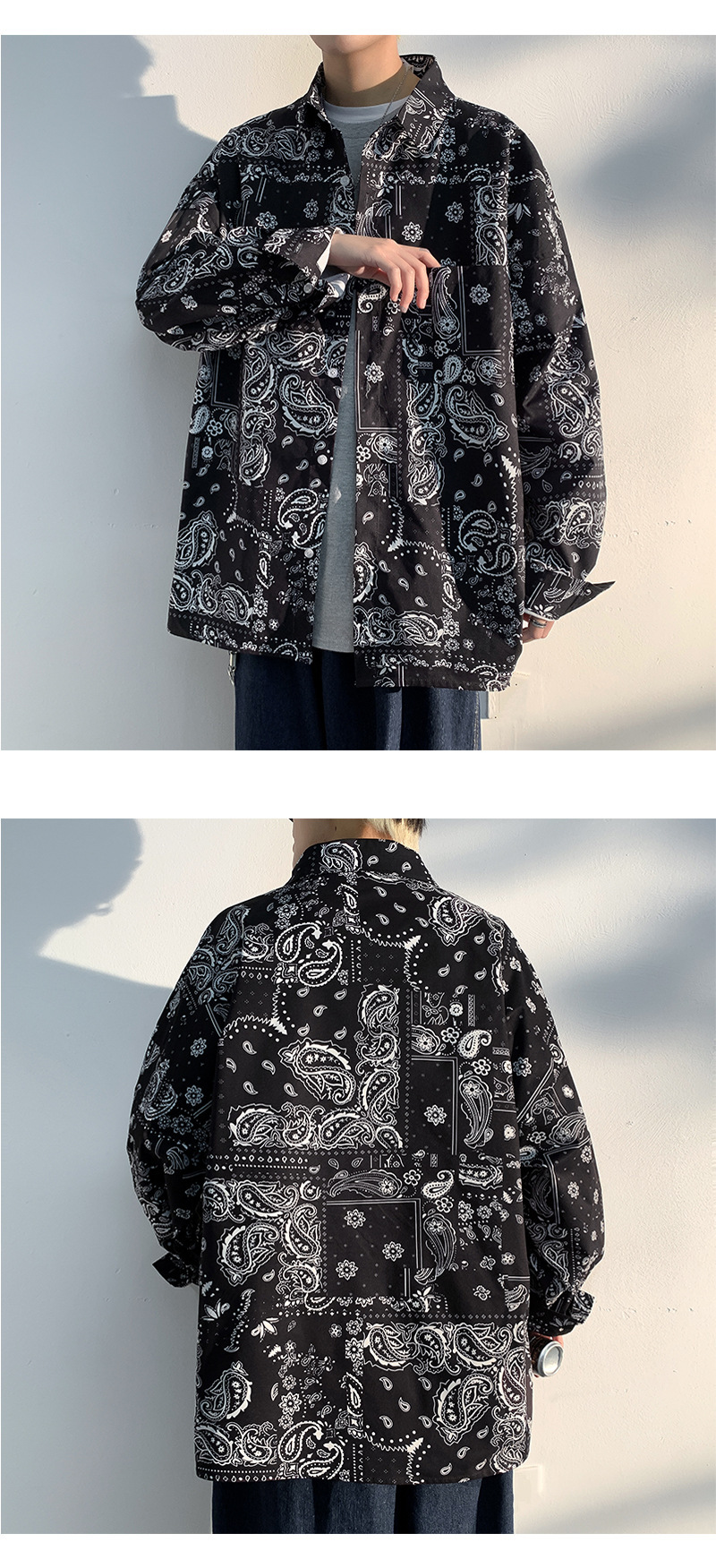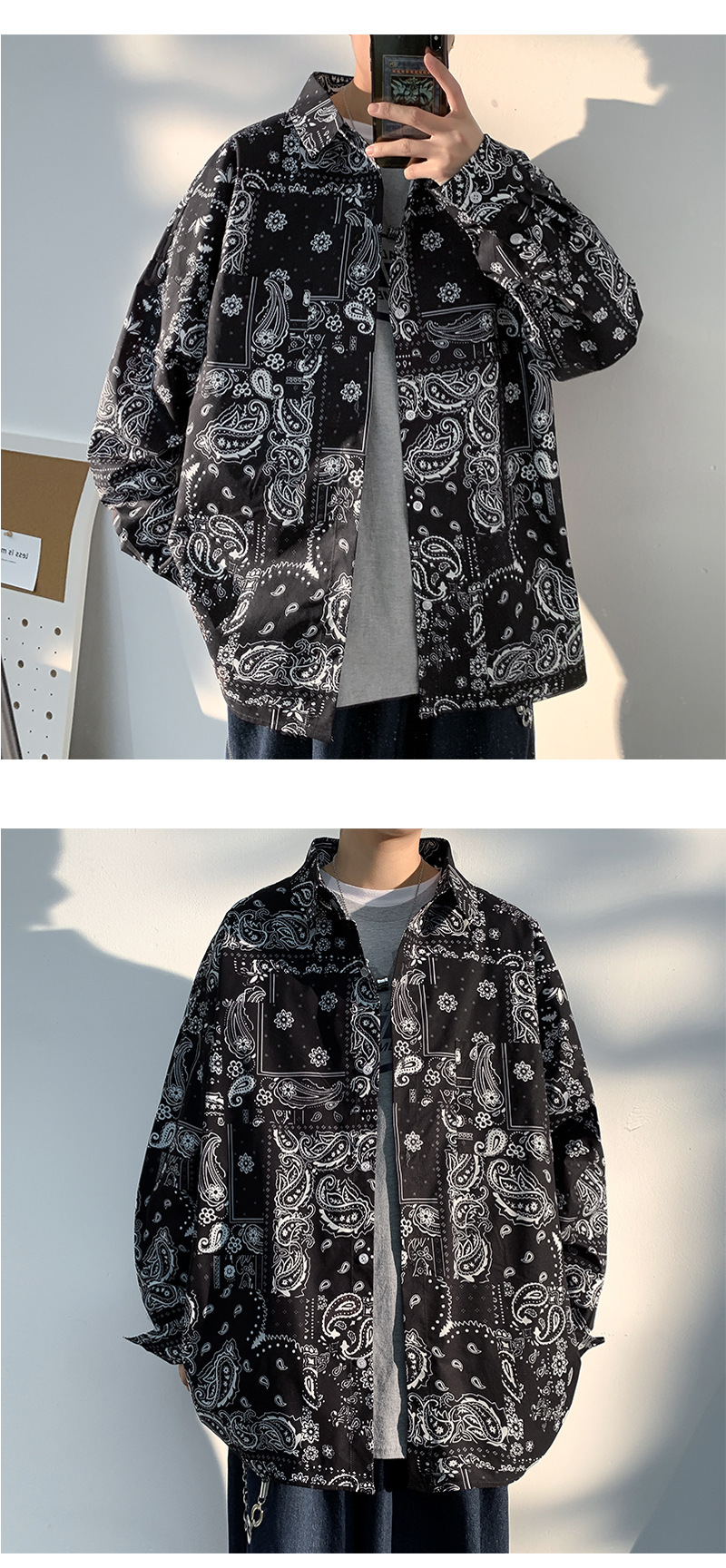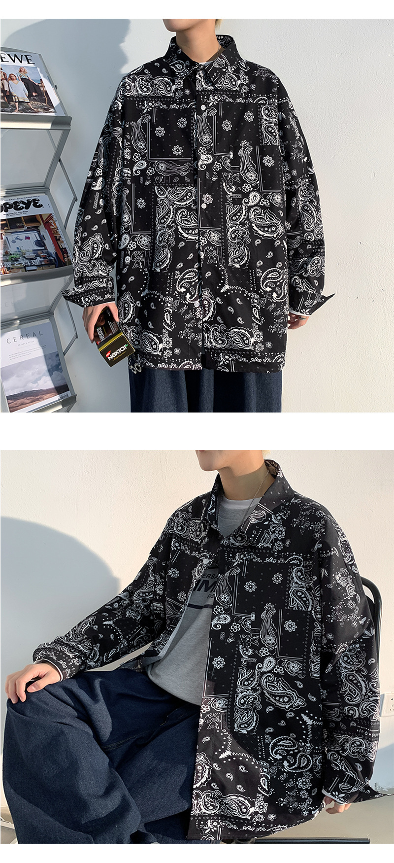 Step into the world of unique fashion with our asymmetrical long-sleeve shirt, designed to make a statement this autumn. The dark black hue is complemented by eye-catching paisley floral patterns, creating a bold visual appeal that sets you apart from the crowd.